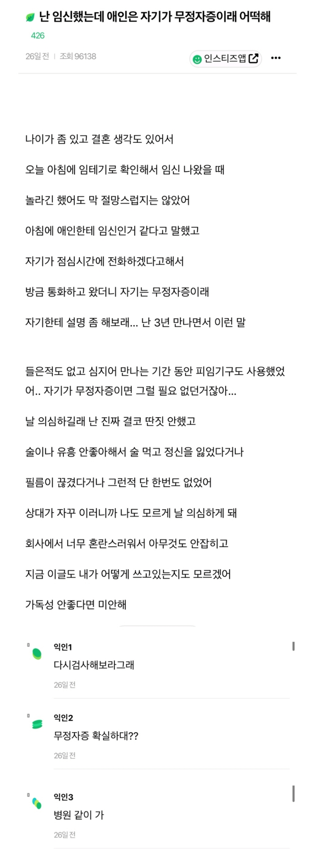 난 임신했는데 애인은 자기가 무정자증이래 어떡해 ,,