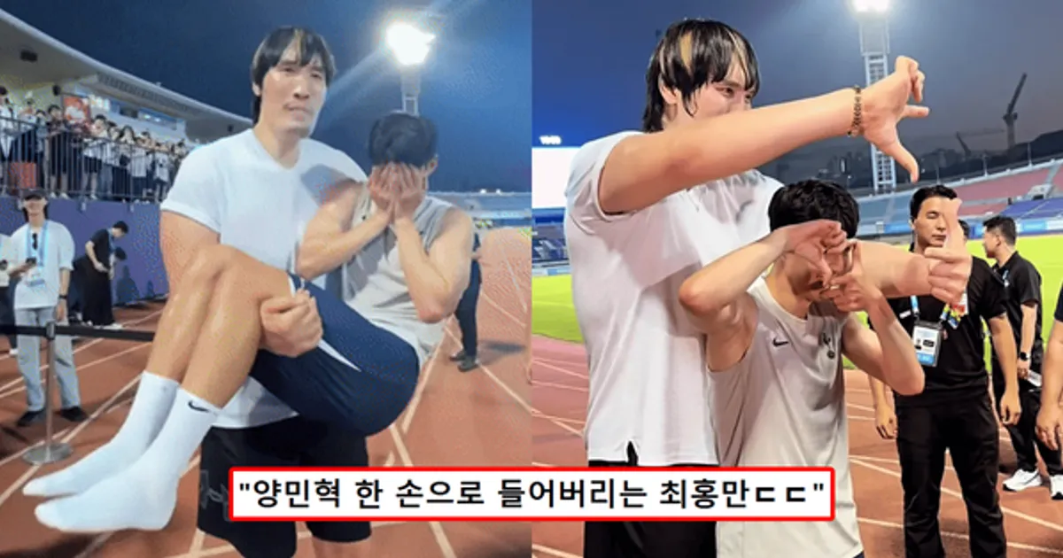 "아잉 부끄러♥"...218cm 최홍만 품에 안겨 '공주님 안기' 당해 수줍어 하는 183cm 손흥민 (영상)