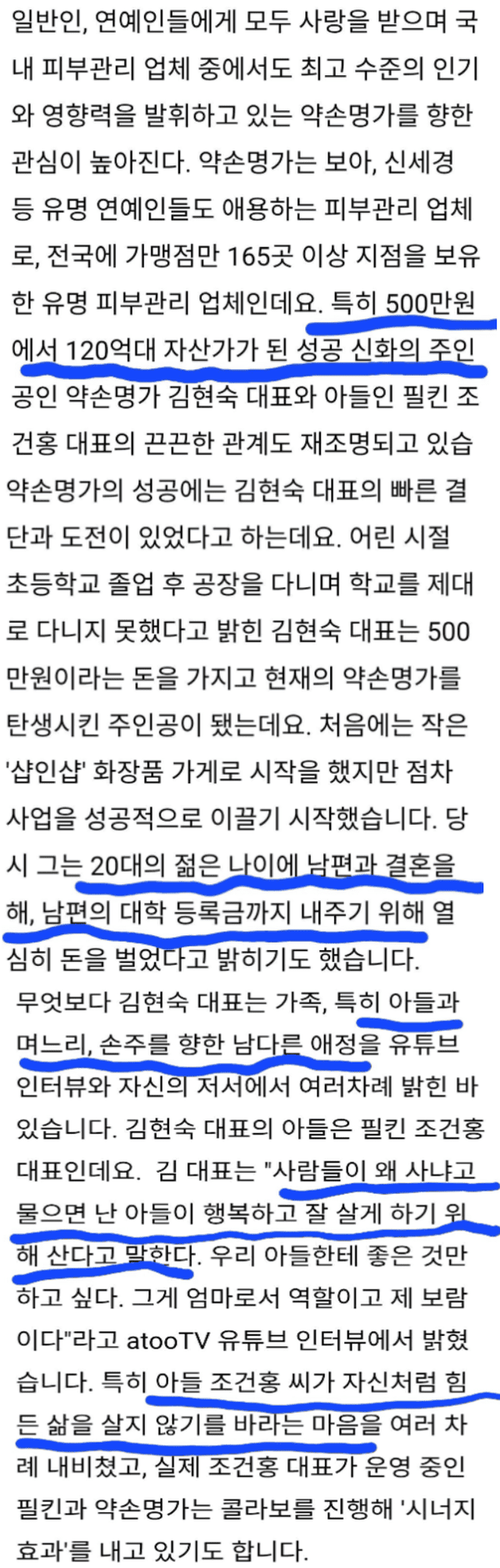 500만원의 자본금을 갖고 샵인샵(가게 속 가게) 형태로 피부 관리 사업을 시작해 100억원대 자산가로 성공한 약손명가 대표는 사업 확장, 후진 양성 등의 활발한 사회활동을 펼치고 있다.