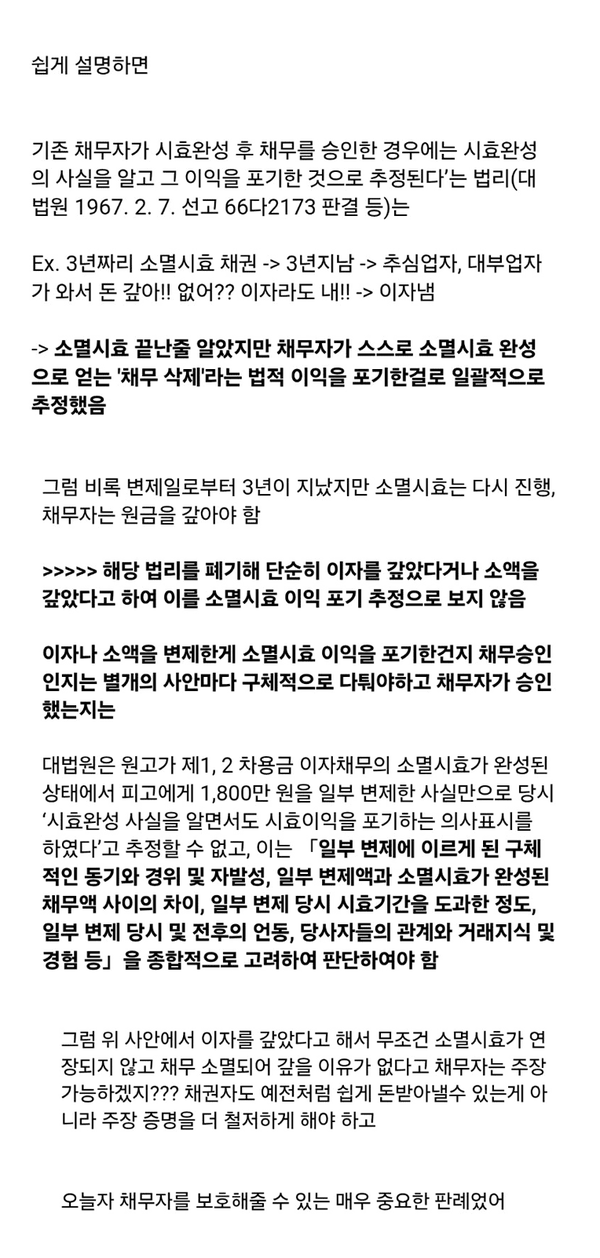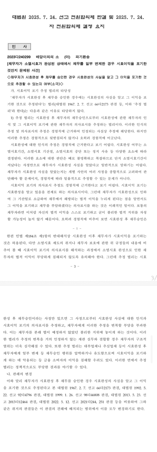 해당 글에 따르면 채무자가 소멸시효 완성 후 채무를 일부 변제하거나 승인한 경우, 시효완성 사실을 알고 이익을 포기한 것으로 단정할 수 없다는 대법원 전원합의체 판단이 나왔다. 기존 판례와 달리, 단순한 변제만으로는 시효이익 포기의 의사표시로 보기 어렵고, 구체적이고 명시적인 의사표시가 있어야 한다는 점에서 법리가 변경됐다.