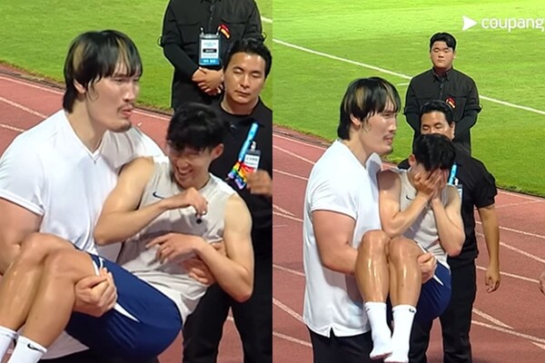 "아잉 부끄러♥"...218cm 최홍만 품에 안겨 '공주님 안기' 당해 수줍어 하는 183cm 손흥민 (영상)
