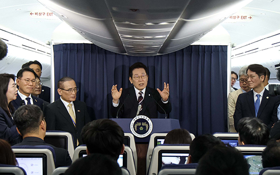 이재명 대통령은 한미 정상회담을 하루 앞둔 24일 일본 도쿄에서 미국으로 향하는 전용기에서 기내 간담회를 열고 "국가 공공 이익을 최우선으로 두겠다고 다짐하고 있다"며 "최종적으로는 현실적이고도 합리적인 결론에 이르게 될 것"이라고 말했다.