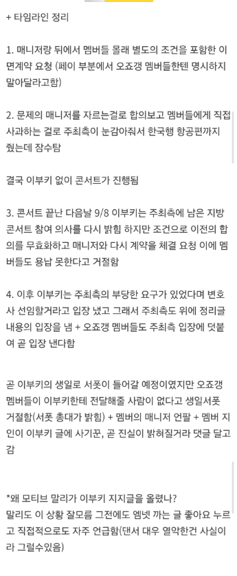 해당 게시물에 따르면 먼저 이부키가 남자친구이자 오죠갱의 매니저인 남성과 뒤에서 멤버들 몰래 별도의 조건을 포함한 이면 계악을 요청했다. 계약서의 페이 부분은 오죠갱 멤버들에게 명시하지 말아달라고 쓰였다. 이후 계약서가 들통나자 엠넷 측이 멤버들과 사과할 자리를 만들어주려고 비행기를 끊어줬지만 이부키는 잠수를 탔다고 한다.