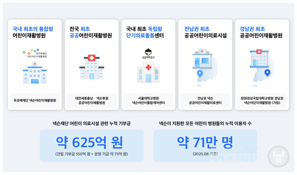 넥슨재단이 지난 10여 년간 어린이 건강권 보장을 위해 후원한 누적 기부금은 625억 원에 달한다. 이 가운데 병원 건립에 약정한 금액은 550억 원이며, 개원 이후 안정적인 운영을 위해 전달한 운영 기금은 약 75억 원이다. 이러한 지원을 바탕으로 넥슨이 후원한 어린이 병원의 누적 이용자 수는 2025년 8월 기준 약 71만 명에 이르렀다. ‘대전세종충남·넥슨후원 공공어린이재활병원’에서 진행된 외래환자 만족도 조사에서는 응답자 99%가 의료 서비스에 대해 긍정적으로 평가했다.