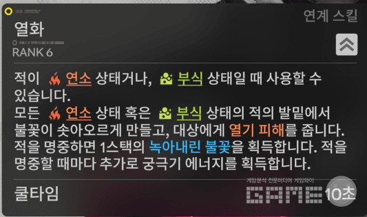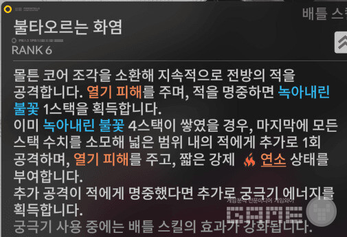 숙지해야 할 부분은 평타 막타 '불꽃의 심장' 패시브와 연계 스킬 '열화', '불타오르는 화염' 배틀 스킬이다.