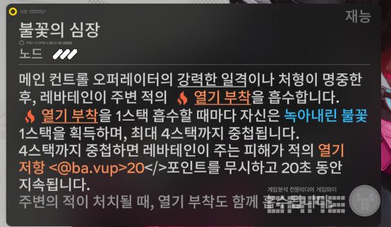 이 강화 배틀스킬을 사용하기 위한 조건이 바로 '불꽃 4스택'이다. 불꽃 스택은 평타 막타를 통한 열기 흡수, 연계스킬 명중, 그리고 강화되지 않은 배틀스킬 사용을 통해 쌓인다. 세 가지 방식은 각각 독립적인 루트라기보다는, 상황에 따라 병행되며 4스택을 채우기 위한 수단으로 작동한다.